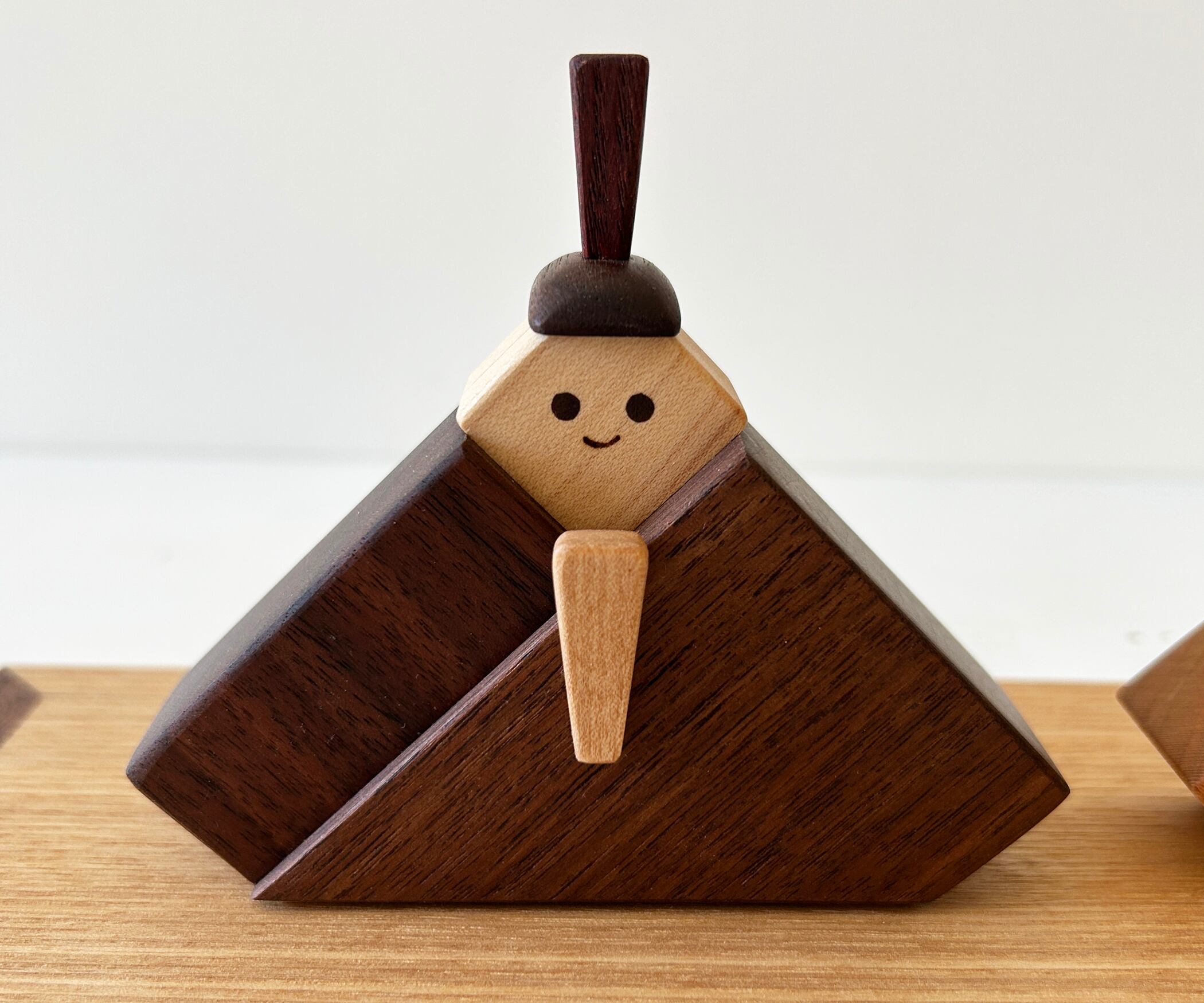数種類の木材を用いることでトーンの違いで変化を出し、本体の厚みに段差を付けることで着物姿を際立たせるようにしました。